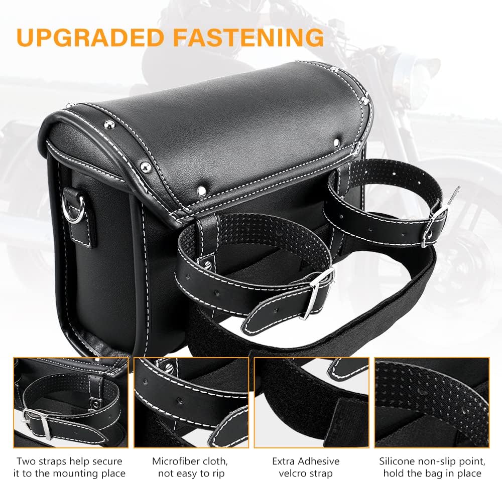 - ★【Widely Used】: NICECNC motorcycle handlebar bag is equipped with upgraded length 13.8 inch self-adjusting leather straps that can be adapted to various sizes of motorcycle forks or vertical bar, such as: motorcycle handlebar, front fork, sissy bar.
